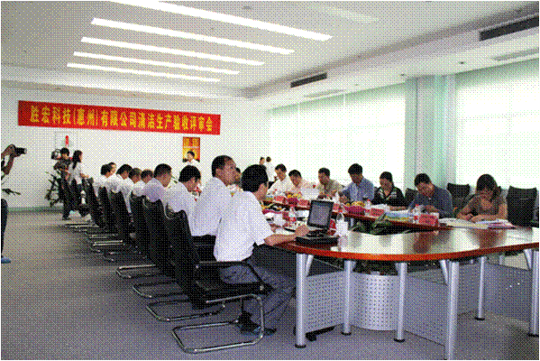 2011年10月19日上午11时,广东省清洁生产中心、惠州市经信局、环保局、科技局等单位的代表以及特邀能源、环保专家,对我司进行清洁生产审核验收,技术依托单位——惠州市惠智通节能环保技术服务有限公司的代表、公司董事长特助赵助理、环??我约案鞑烤聿渭恿俗移郎蠡?。