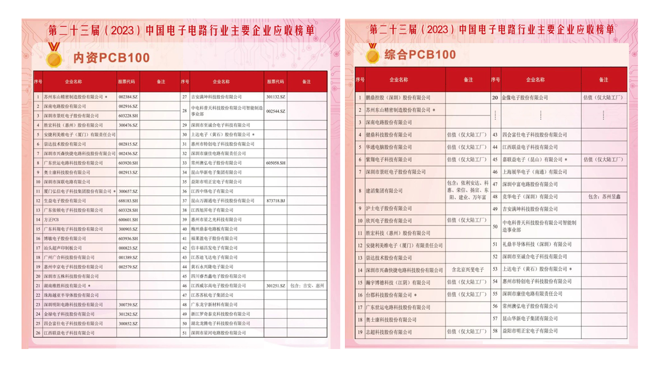 近期,中国电子电路行业协会(CPCA)正式发布了《第二十三届(2023)中国电子电路行业主要企业营收榜单》。金年会科技凭借稳健坚韧的市场表现与综合实力荣登2023年度内资PCB百强榜单第4名,同时在综合PCB排名中位列第11名。